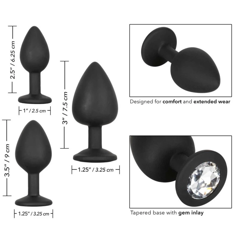 Découvrez les plaisirs de la pratique anale grâce à ce Kit 3 Plugs Anal Bijou Silicone Gem Anal Kit de CalExotics ! Commencez simplement avec le plus petit puis passez aux tailles supérieures une fois que vous vous sentez prêt à recevoir une stimulation plus intense.
