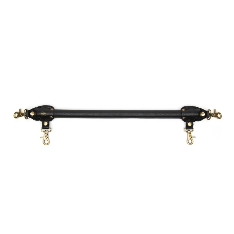La barre d’écartement en similicuir noir est très robuste. Elle possède des détails métalliques dorés garantis sans nickel pour une touche encore plus érotique. Elle comprend également 4 mousquetons vous laissant ainsi la possibilité d’accrocher des menottes ou un hogtie et de réaliser une véritable séance en couple !