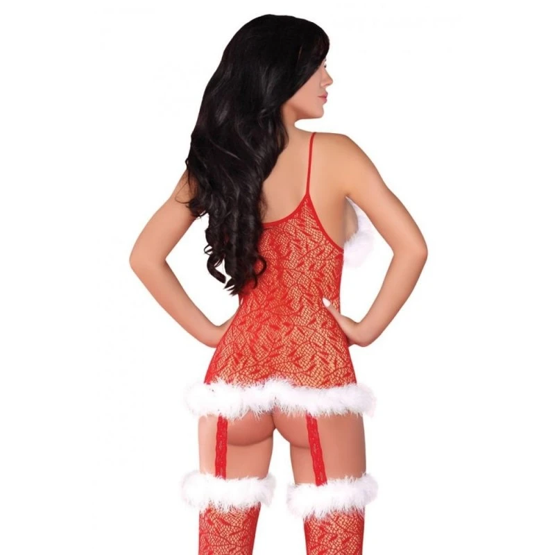 Portez cette magnifique combinaison rouge et mettez votre poitrine en valeur avec ce décolleté à couper le souffle, de la fourrure blanche douce se trouvera tout autour de votre haut et également au niveau du bas de votre lingerie.
