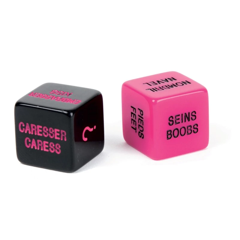 Le dé noir indique l’action à réaliser (ex : Embrasser, Mordiller, etc.), tandis que le dé rose vous donne la partie du corps sur laquelle doit être réalisée l’action (ex: Lèves, Fesses, etc.) ! Une des faces contient un point d’interrogation qui vous permettra de laisser libre cours à votre imagination…