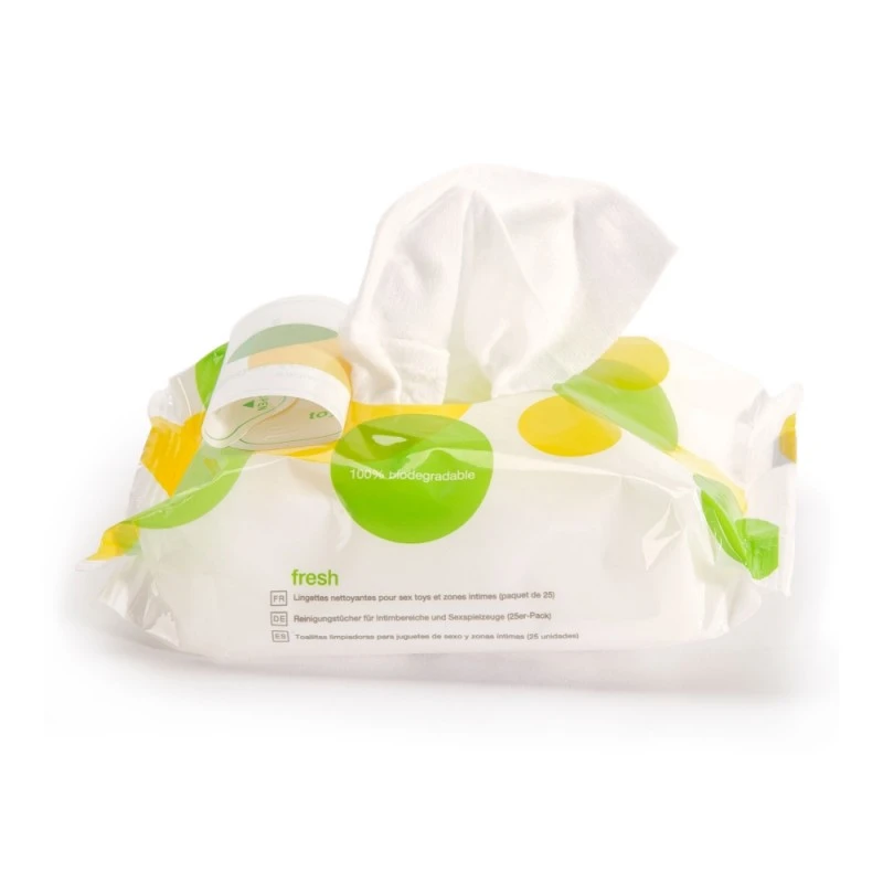 Découvrez le Pack de 25 Lingettes Nettoyantes Biodégradables Fresh de Lovehoney ! Elles vous permettront de prendre soin de votre intimité après un rapport sexuel, ou bien pourront aussi nettoyer vos sextoys favoris. Quel que soit l’usage que vous souhaitez en faire, ce petit paquet de 25 lingettes pourra vous suivre dans chacun de vos déplacements avec son format pratique !