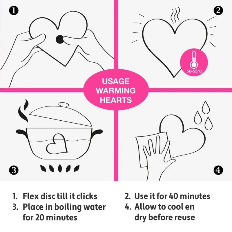Les Cœurs de Massage Chauffants ont 3 couleurs et motifs différents. Ils sont réutilisables, il suffit de les plonger dans de l’eau bouillante pendant quelques minutes.