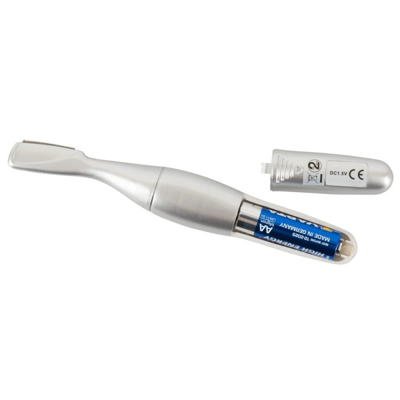 Votre rasoir Rasoir Intime de Précision Shave Me Bikini s’utilise avec une pile AA (non incluse). Une brossette de nettoyage et un étui de rangement sont fournis.